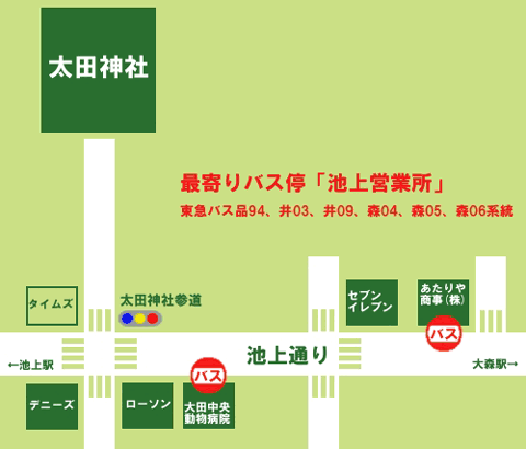 交通案内 JR大森駅・東急線池上駅より 東急バス 品94、井03、井09、森04、森05、森06系統 「池上営業所」下車