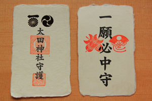 一願必中守 合格・必勝祈願、心願成就を望まれる方にお勧め致します。手漉きの和紙で名刺サイズです。財布や手帳などに入れて下さい。 表 裏